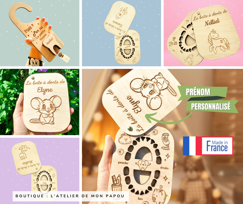 Chez L’atelier de mon Papou, chaque boîte est fabriquée à la main et personnalisée avec une gravure sur bois au prénom de l’enfant. C’est le genre de petit objet qu’on glisse dans une boîte à souvenirs, et qu’on ressort des années plus tard avec une pointe de nostalgie : « Tu te souviens, mon coeur, de ta toute première dent ? » (et là, forcément… mini larmichette 💛).